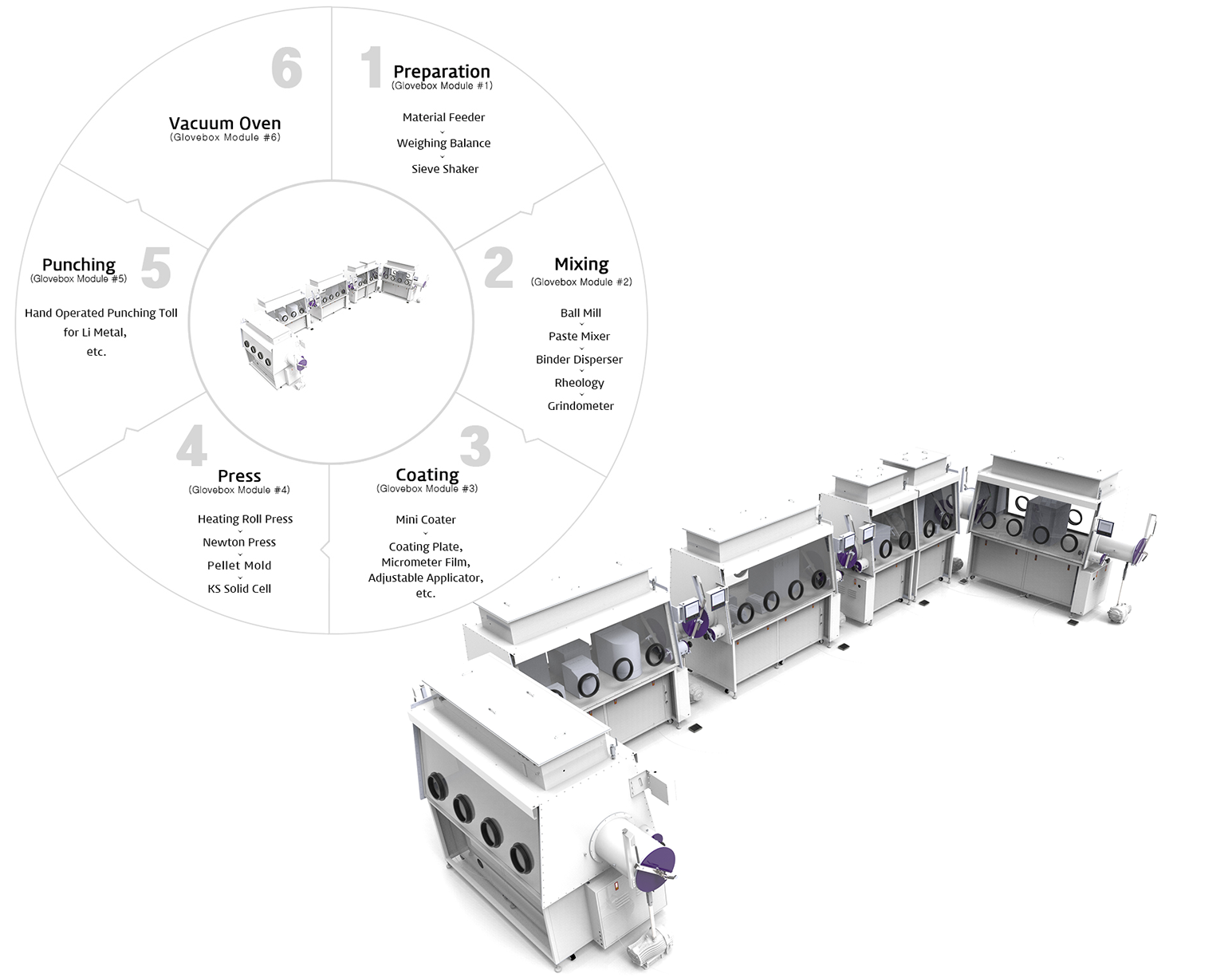 - 工程別、研究開発の便利性を為、各グローブボックスをT型チャンバーで繋ぐ。